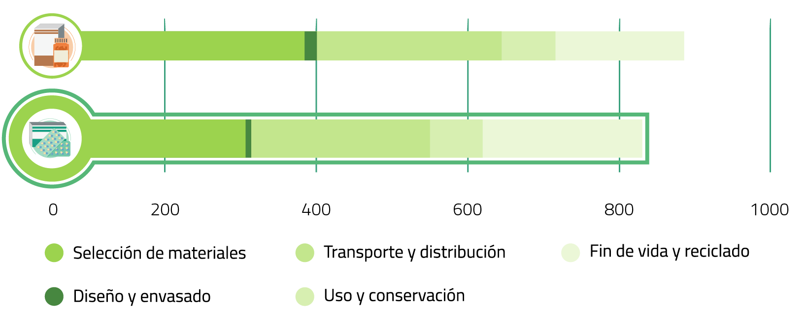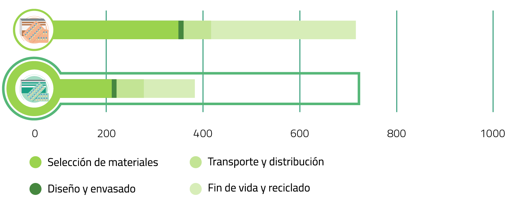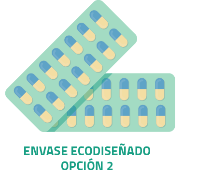 Entre las diversas iniciativas, se considera la reducción de peso y volumen de los blísteres, optimizando así los espacios vacíos entre alveolos. Esta mejora, permite reducir las dimensiones y el peso del envase externo (estuche), ajustándose al nuevo tamaño de los blísteres: