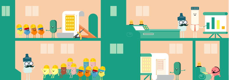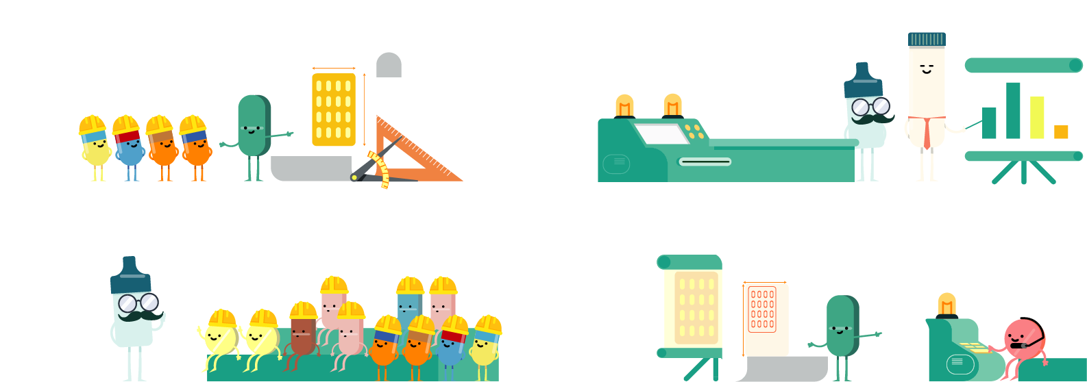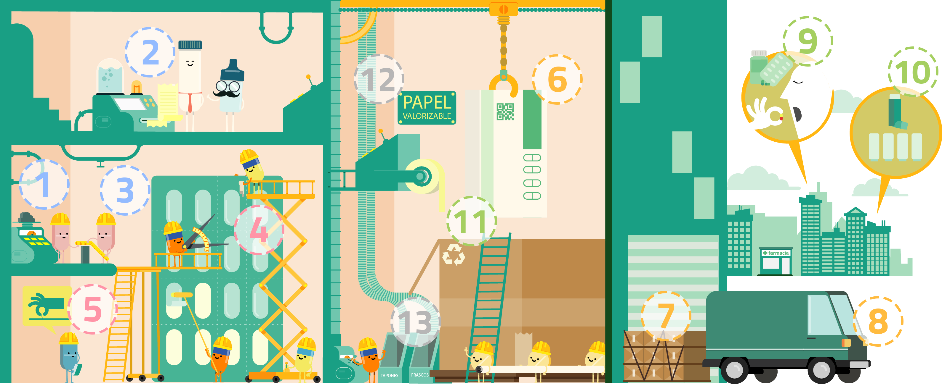 En cada una de las siguientes etapas del ciclo de vida de los envases farmacéuticos, es posible encontrar diversas áreas de actividad en las que desarrollar diferentes líneas de actuación. Sitúa el cursor sobre los diferentes elementos interactivos: